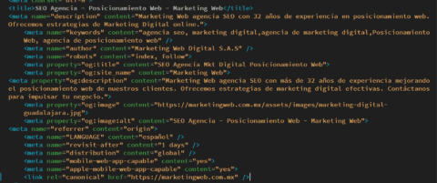 <meta property=”og:description” content=”Marketing Web agencia SEO con más de 32 años de experiencia mejorando el posicionamiento web de nuestros clientes. Ofrecemos estrategias de marketing digital efectivas. Contáctanos para impulsar tu negocio.”>
