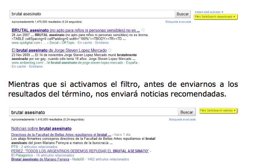 El problema con Google es que su filtro es no es muy seguro y deja pasar muchos resultados. Hay que tomar en cuenta que Google hace negocio con su motor de búsqueda, mientras que Yahoo! y Bing tienen tratos comerciales con publicidad en sus contenidos de noticias.